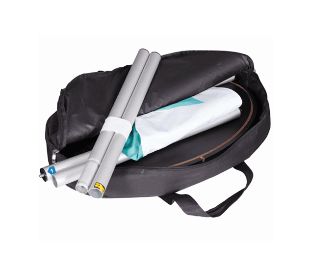 The Textile Oval Counter by EasiDisplays is a compact and versatile counter solution designed to pair seamlessly with textile PopUp backdrops and fabric display walls. Its lightweight construction and clean oval shape make it ideal for exhibitions, events, and promotional spaces where portability and presentation are equally important. This counter is well suited to a wide range of uses, including meet-and-greet points, product displays, literature stations, sign-in areas, and charity collection tables. The structure is built around a solid MDF top and base, finished in black, which provide stability while keeping overall weight manageable. The fabric graphic wrap is secured neatly at the top and bottom and can be supplied in several finishing options. Graphics can be stitch-finished, partially open, or fitted with a zip, allowing the internal space to be accessed for discreet storage during use. Three strong screw-in aluminium poles connect the top and base, creating a rigid and reliable structure without the need for tools. Designed for quick setup and easy transport, the Textile Oval Counter offers a practical and visually consistent addition to any fabric-based display environment.